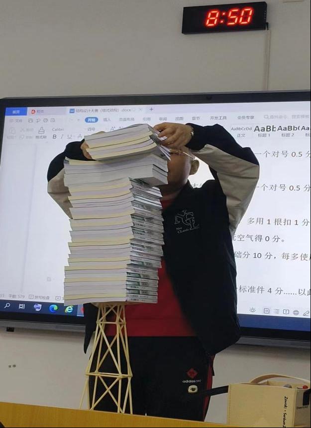 本次模拟赛参赛选手共38人,分为13组每组3人参加比赛。每个参赛小组根据设计理念完成设计草图,按照2024年全国大学生结构设计大赛要求,制作塔式结构,并做竖向载荷试验。通过对理论方案设计情况、美观情况、材料用量、连接方式设计、承重数量等方面的指标对各组进行打分,决定冠军团队归属。比赛过程中该专业学生全员参与,反响热烈。