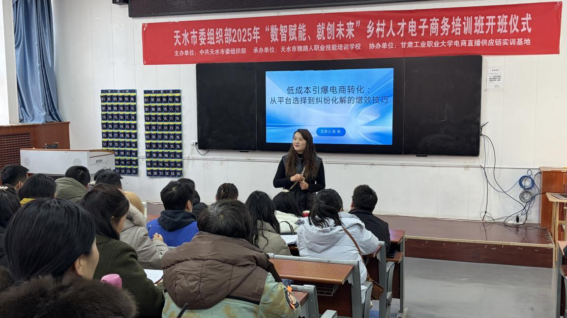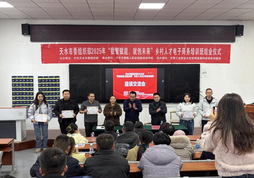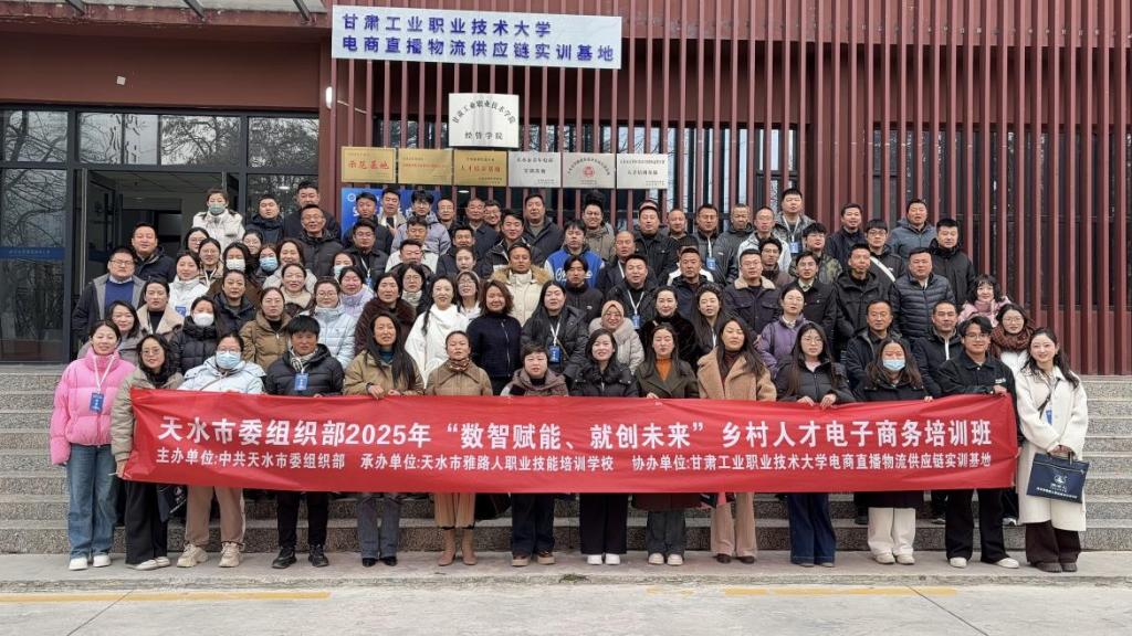 2025年12月22日至12月26日,由天水市委组织部主办、天水市雅路人职业技能培训学校承办、甘肃工业职业技术大学电商直播物流供应链实训基地协办的2025年“数智赋能、就创未来”乡村人才电子商务培训班成功举办。来自全市各县区的百名乡村电商骨干参加了此次为期5天的集中培训。