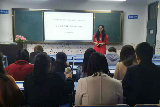 2021年4月2日下午,经济管理系在1-213教室举行了人才培养方案和课程标准制订经验分享交流研讨的教研活动,在活动中,参加过世行贷款甘肃职教项目人才培养方案和课程标准制定培训的王玥老师,陈海峰老师,王友平老师,张宁老师进行了经验分享。