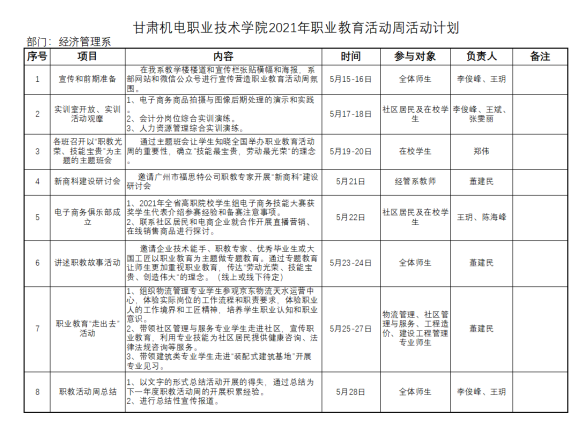 经济管理系2021年职业教育活动周于2021年5月15日正式拉开帷幕。本次“职教活动周”系列活动在设置安排上按照学院“2021年职业教育活动周启动会”的会议精神,紧紧围绕“技能:让生活更美好 ”这一主题进行。内容和形式上大力弘扬劳动光荣、技能宝贵、创造伟大时代风尚,宣传技能创造美好生活,积极展示了甘肃省职业教育“长入经济、汇入生活、渗入人心、融入文化、进入议程”的改革发展成果和做法,进一步营造全社会关心支持职业教育的良好氛围,充分展示我院办学实力和办学水平。