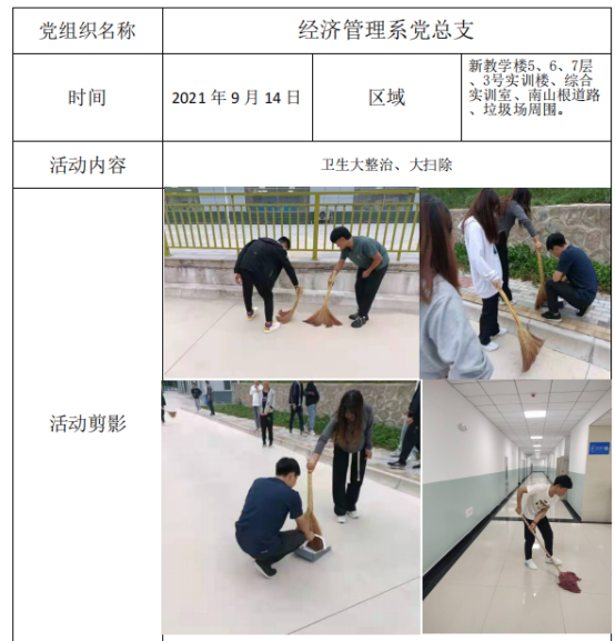 2021年9月14日,经济管理系党总支全员齐行动,积极参与文明校园创建活动,对所属区域进行卫生大整治、大清扫。