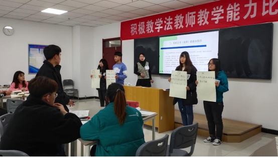 本次比赛由王玥,廉军、王小弟三位通过第一期积极教学法培训,有丰富积极教学法教学实践经验的老师担任评委,并邀请了各专业骨干教师和负责经管学院的院级督导组成专家团进行观摩和交流。